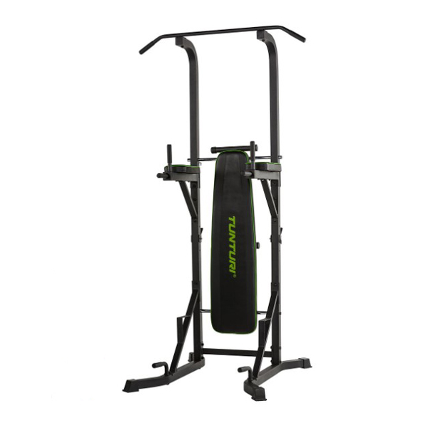 Combineert pull-up, VKR/dip, barbell bench en buikspier met brede chin-up/optrek-stang. Rugsteun kan omgeklapt worden tot barbell bench of ab board.