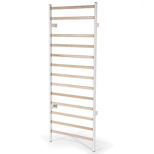 Wandrek met ovalen houten sporten en gepoedercoat stalen scharnieren om aan de muur te bevestigen